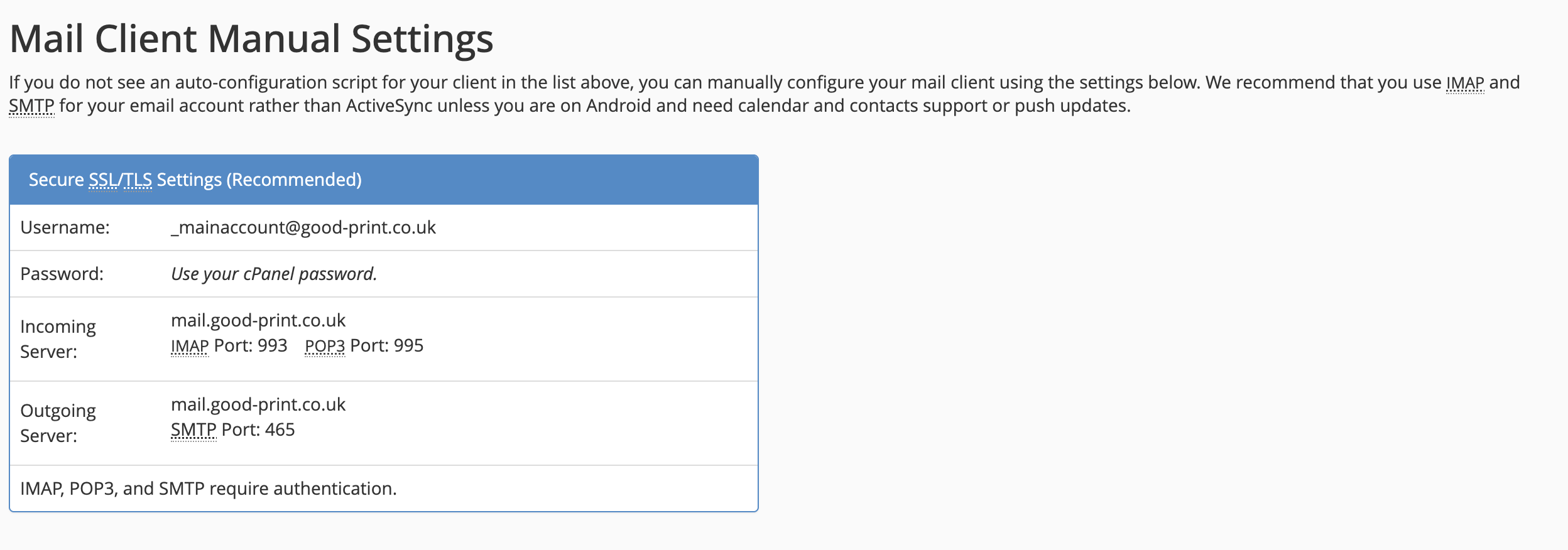Incoming server (usually mail.yourdomain.co.uk) Outgoing server (usually mail.yourdomain.co.uk) IMAP Port: 993 POP3 Port: 995 The final detail is the SMTP port. Our servers, and most modern email clients are capable of using a newer encryption (called STARTTLS) and this is served by Port 587. If your email client is older and only supports SSL then you can use Port 465. These are all the details you'll generally require to setup any email client.